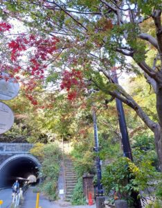 今回はトンネルくぐった先まで歩いて「火の見下」というバス停横からコースに入ることにしました